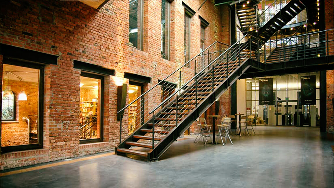 Um das Flair des alten Industriegebäudes beibehalten zu können, blieb die Ansicht von Betondecken, Stahlträgern und -stützen weitestgehend erhalten. Lediglich im Bereich von Besprechungsräumen oder WC-Anlagen wurde mit Deckensegeln bzw. Unterdecken gearbeitet.